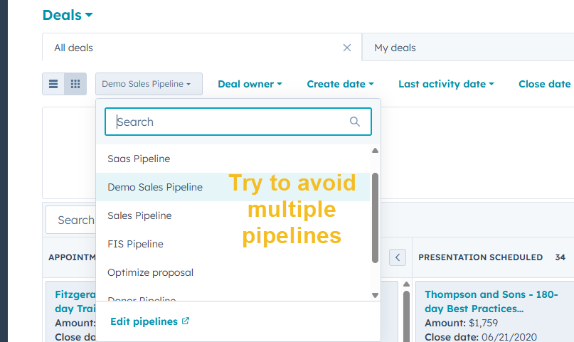 Instead, build one pipeline and use a custom property like Service Type or Region. Make that property required when creating a deal. Now you can segment your reports by that field without splintering your pipeline. It keeps things clean, consistent, and easy to track.