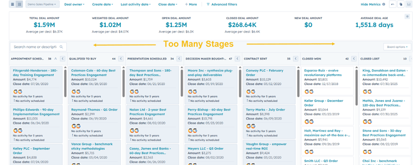 Too many stages create confusion. Some companies add ten or more steps, thinking more detail means more accuracy. In reality, it just slows reps down and makes reporting impossible.